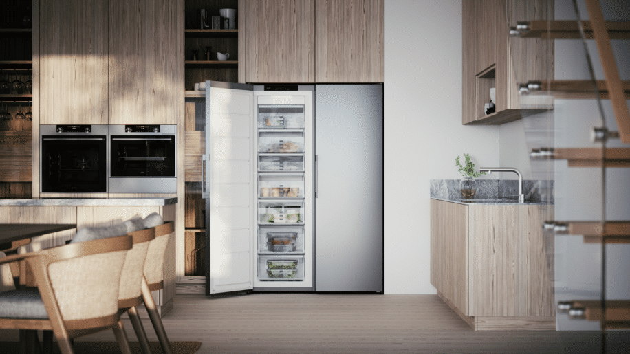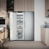 Et stilrent fryseskap i rustfritt stål med vertikalt håndtak og et sjenerøst volum på 280 liter. No Frost-frysesystemet eliminerer behovet for avriming og sparer energi. Du kan oppbevare alle typer matvarer på alle hyller takket være Cool Flow-systemet som sørger for at den kjølige luften fordeles jevnt i hele fryseren.