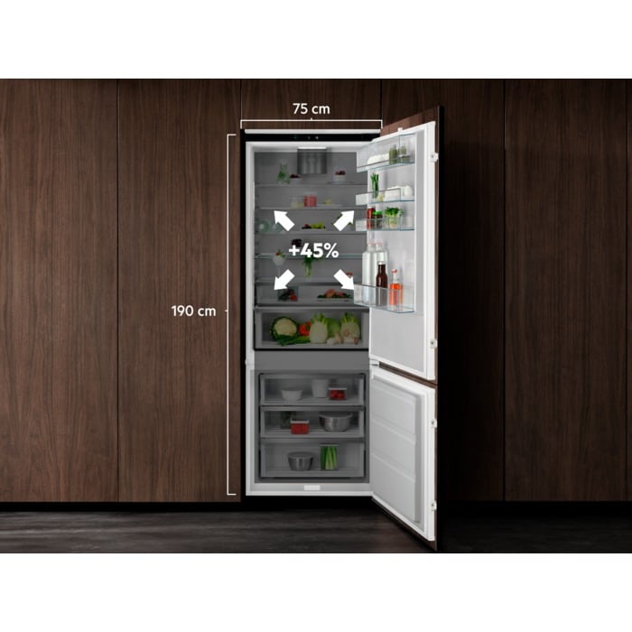 Int.kombiskap MAXISPACE, 1894x710x560, glidehengsler, D, 35 dB(A)/B, 287+89L, DynamicAir, NoFrost, Elektronisk, Dig. display, WiFi, ECOMETER, GreenZonePlus m/automatisk fuktighetskontr, ExtraZone-skuff, FlexiShelf, flaskestopp, Topp/side LED, AirFilter, Temp. og døralarm, 1 kompressor + valve, kan omhengsles, Resirkulert innvendig plast,