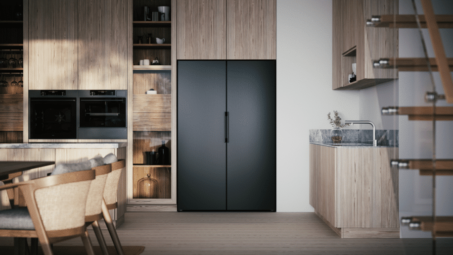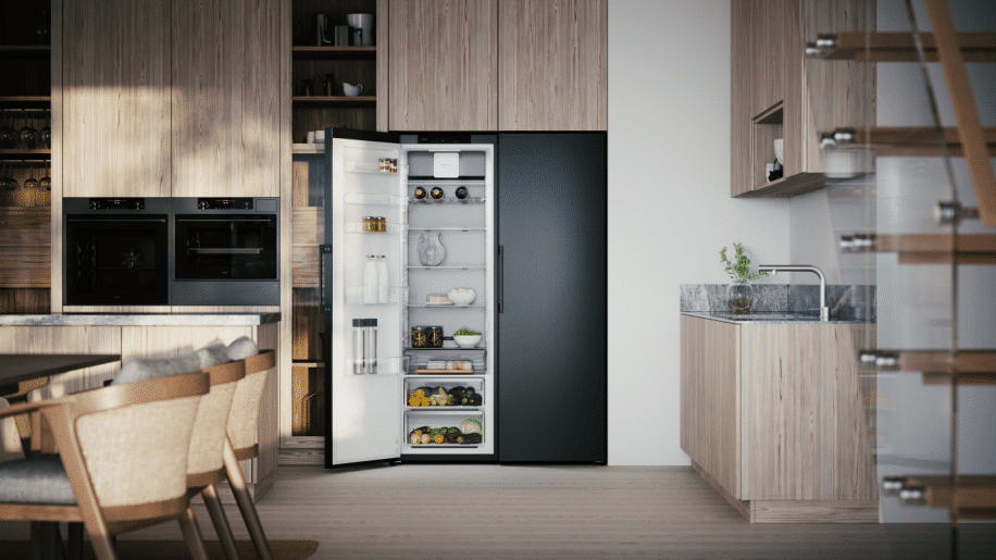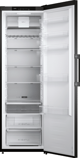 Et stilig kjøleskap i Black Steel med vertikalt håndtak og et generøst volum på 384 liter. Adaptive Temperature Control™, Auto Humidity Control og Multi Zone Drawer sørger for at maten holder seg fersk lenger. Du kan oppbevare alle typer mat på alle hyller takket være Cool Flow-systemet som sørger for at den kjølige luften fordeles jevnt i hele kjøleskapet.