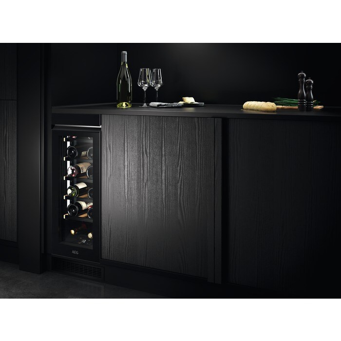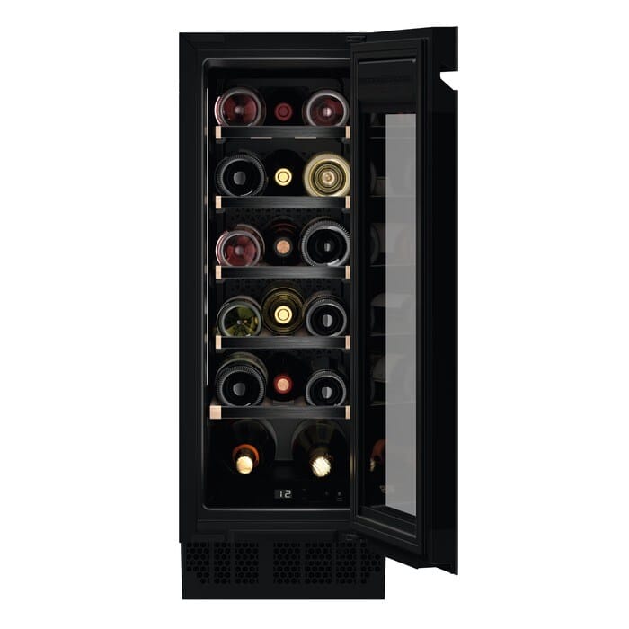 Vinskap, Innebygd/Under benk, 18 flasker (lett tilgang til 16 flasker), G, C-støy, Elektronisk kontroll, Singel temp.sone, +5 til +20°C, Innvendig side LED-lys, UV-bestandig glassdør, 5 hyller (4 på skinner), HxBxD: 818x295x573, BI mål HxBxD: 820-870x300x560 mm