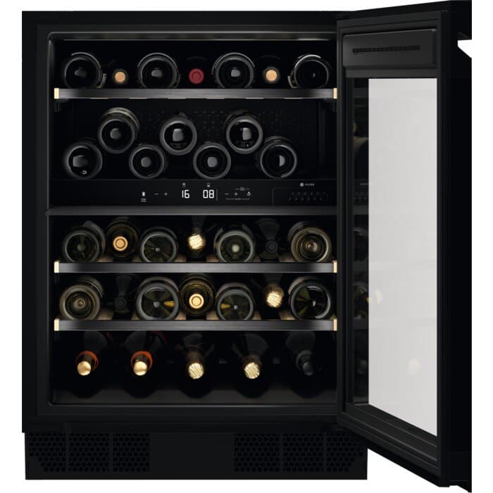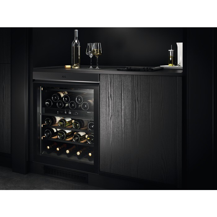 Vinskap, Innebygd/Under benk, 40 flasker (lett tilgang 26 flasker), G, C-støy, Elektronisk kontroll, 2 temperatursoner, Innstillinger: +5 til +20°C, Innvendig side LED-lys, UV-bestandig glassdør, 3 hyller på skinner, HxBxD: 818x595x577, BI mål HxBxD: 820x600x560