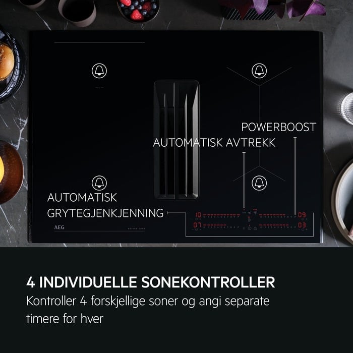 Combohob, induksjonstopp m/ventilator, 68 cm, 4 soner, Bridge, slider, Pot Detection, A+, 630 m3/t, kullfilterversjon. PASSER I 60CM SKROG