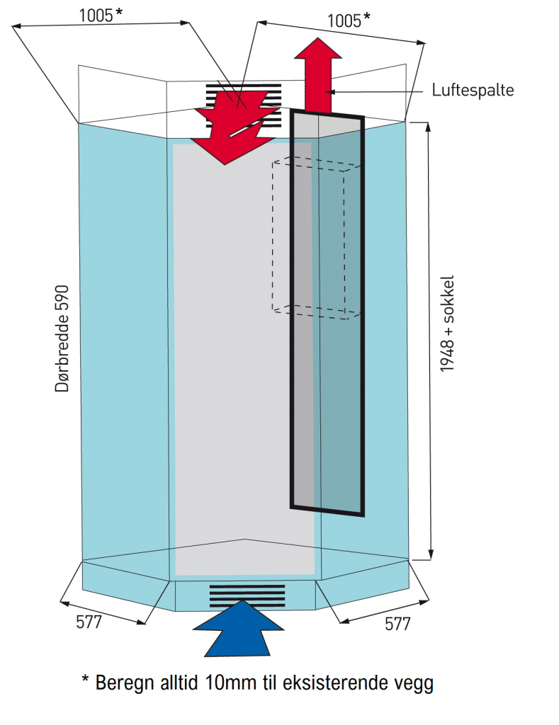 1005mm x 1005mm ( i tillegg beregn alltid minimum 10mm klaring til eksisterende vegg)
